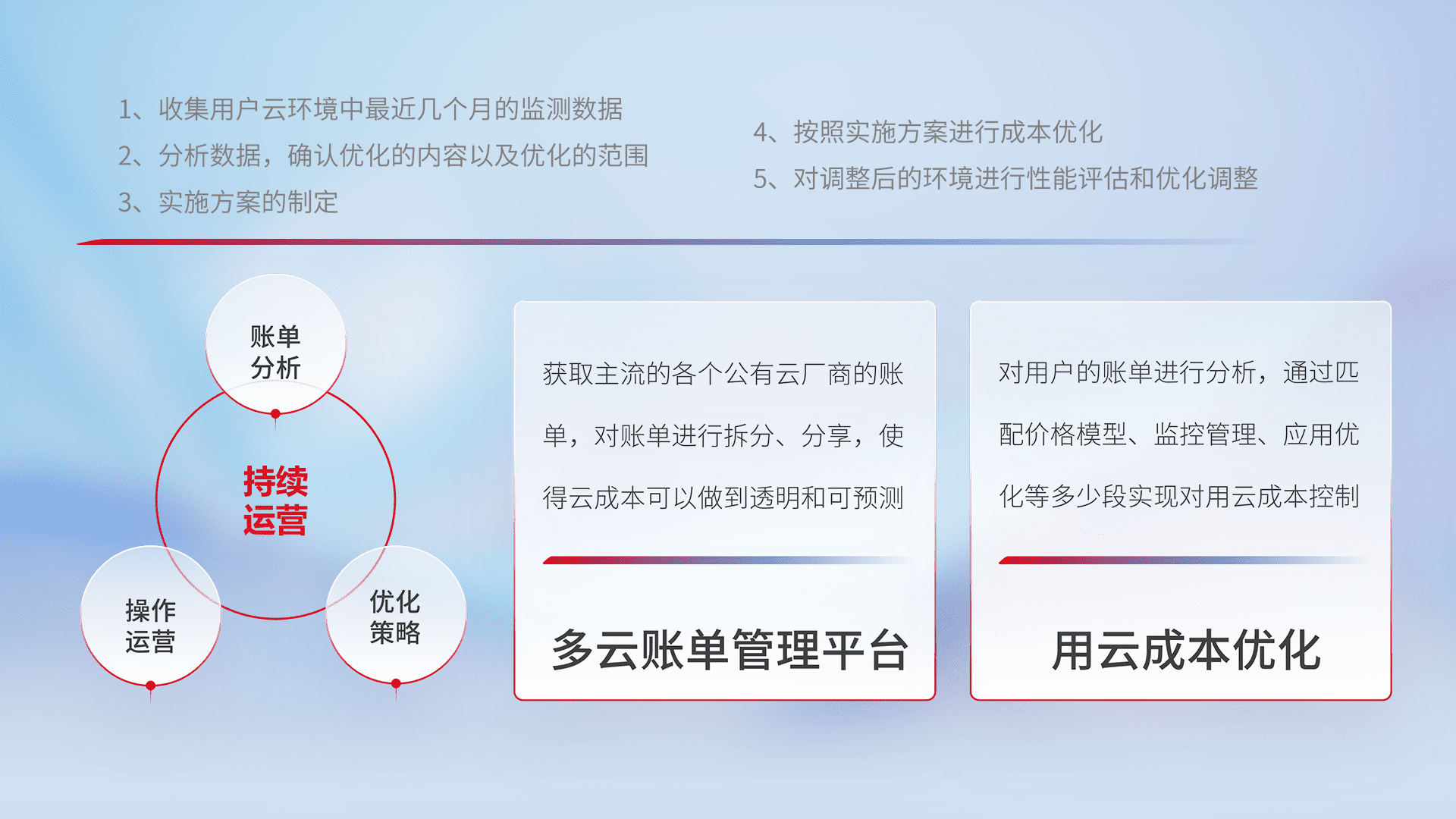 通过多云纳管,,以统一的资源数据模型把客户的云资源进行抽象和封装,,,进而实现对多云资源的统一操作,,保障云资源管理的可靠性、、稳定性与可用性。。量身定制化运维内容,,配置、、、、开发运维、、、补丁管理、、备份、、、监控、、、、认证和访问管理、、、审计和日常巡检等,,保障在用云过程中的可靠度,,稳定度以及高可用率。。。。